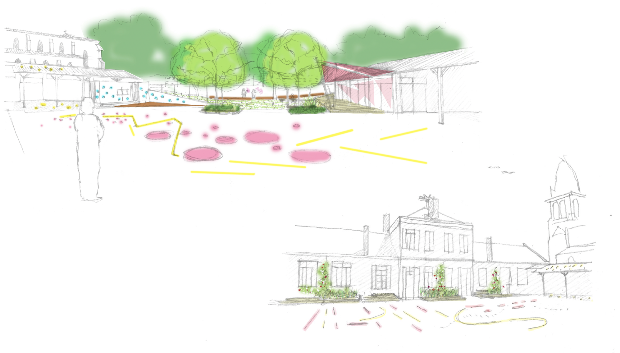 Dans ce scénario, la cour maternelle est agrandie par l’intégration de l’espace libéré par le déplacement du monument aux morts, tandis que la cour élémentaire conserve les surfaces nécessaires aux pratiques sportives tout en intégrant de nouveaux aménagements végétalisés.